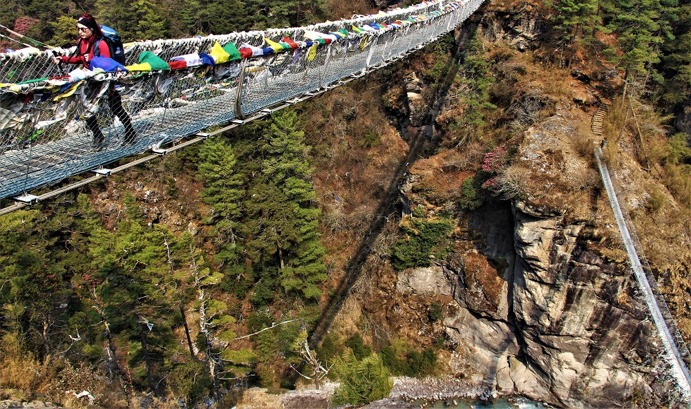 a. Phakding: Trek from Lukla to Phakding, a small village situated at an altitude of around 2,610 meters (8,562 feet). The trail follows the Dudh Koshi River, and you'll cross several suspension bridges along the way.